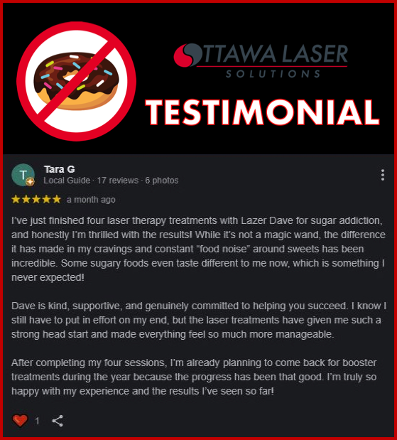 Scientific research and Lazer Dave’s clinical experience combined point to compelling and consistent results when Low-Level Laser Stimulation (LLLS) is used to support individuals aiming to reduce their intake of processed sugar, refined carbohydrates, artificial sweeteners, and other habit-driven food triggers. See references to the scientific literature above and Ottawa Laser Solutions’ Google Reviews.